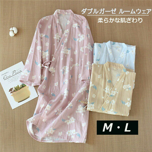 ルームウェア パジャマ 寝巻き ガーゼ 浴衣 ガウン お風呂上がり バスローブ レディース 花柄柄 長袖 綿 2重ガーゼ 前開き 夏素材 旅館 温泉 介護 通気性 涼しい 部屋着 お家時間 柔らかい 着心地いい プレゼント ピンク ブルー ベージュ dh094c0c0jc