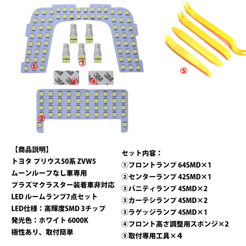 改良版 プリウス 50系 LED ルームランプ トヨタ PRIUS ZVW5 専用設計 7点セット126発 ホワイト ムーンルーフなし車用 室内灯 ルームランプセット 取付簡単