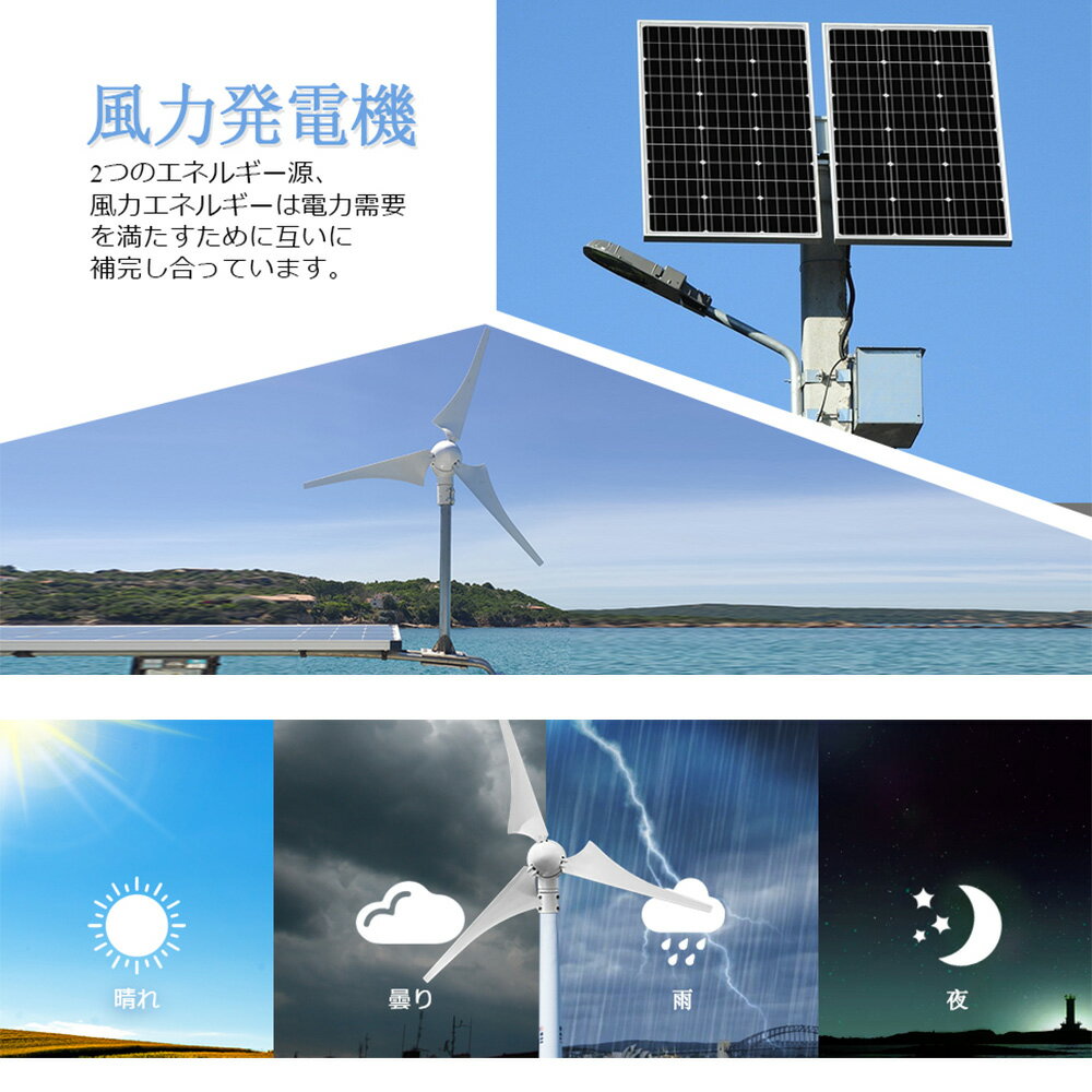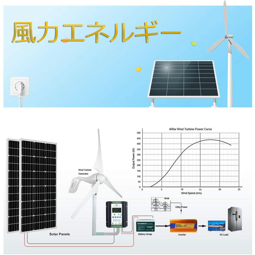 ■セット内容 風力発電機*1セット PWM20Aコントローラー*1個 風力発電機 定格バッテリー電圧: DC 12V/24V ローター直径 1.2m 定格風力発電機容量 400W 羽根材質 カーボン繊維 最大放電電流 20A 定格風速 12m/s カットイン風速 2.5m / s 78.3 mph以上 定格出力 400W(最大風速35m/s)PWMチャージコントローラ 定格バッテリー電圧 DC 12V / 24V 風力発電機容量 400W 風力発電機のブレーキ電圧 14.5V / 29V 風力発電機の回復電圧 13.2v / 26.4v 【SOLAR_all】